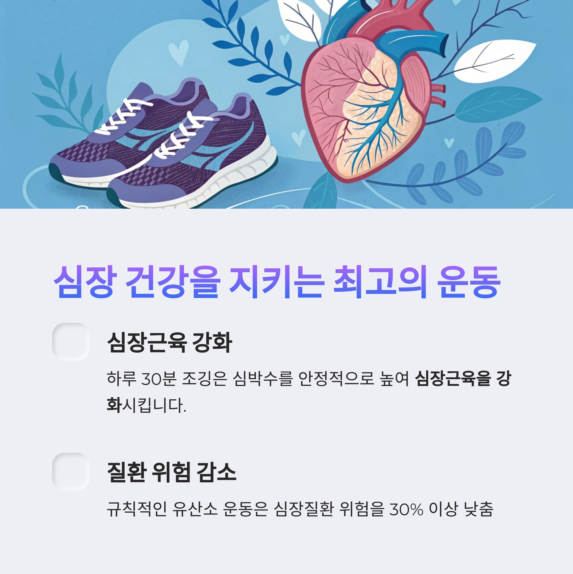 규칙적인 유산소 운동은 고혈압, 고지혈증, 심장질환 위험을 30% 이상 낮춘다는 연구 결과도 있습니다.