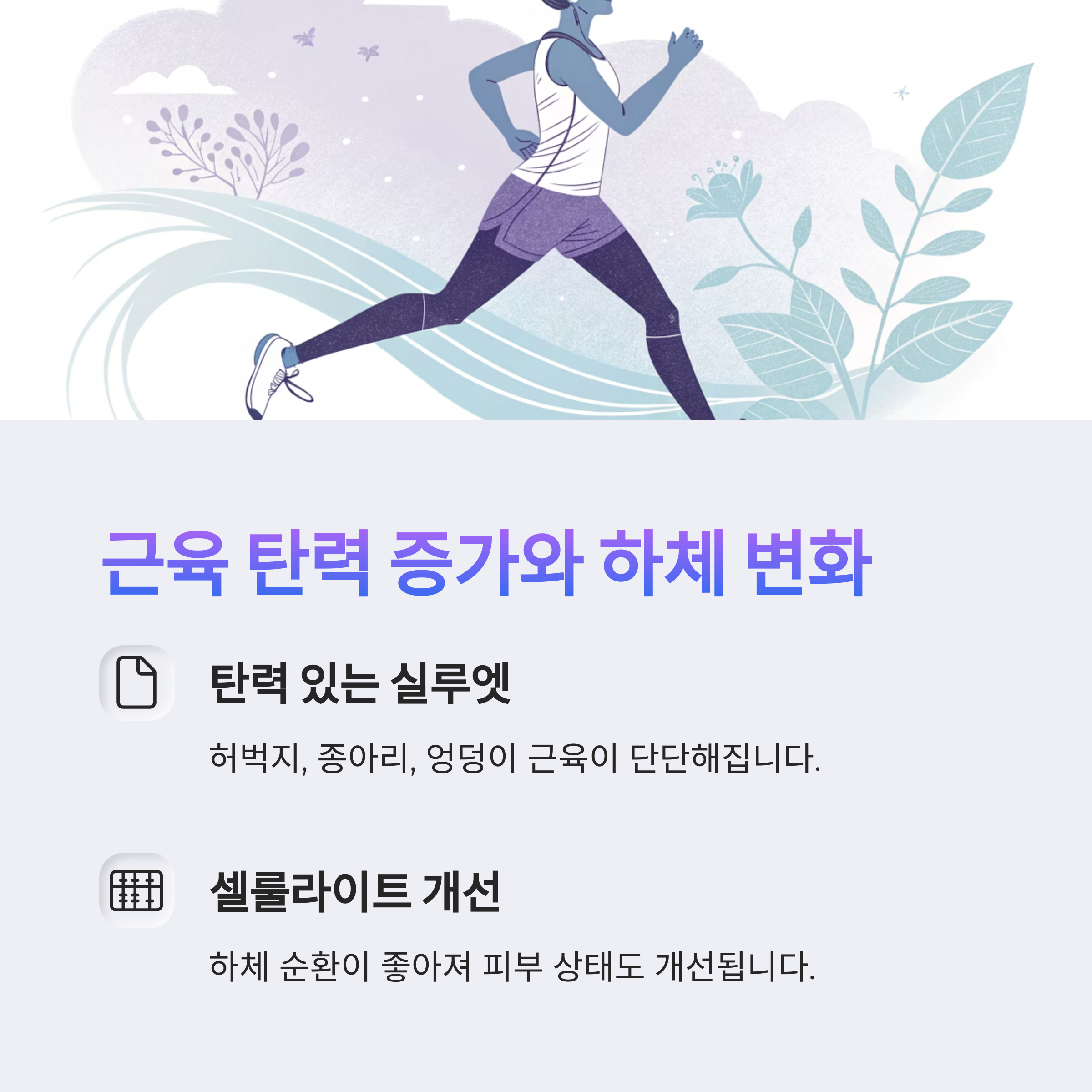 특히 허벅지, 종아리, 엉덩이 근육이 단단해지면서 탄력 있는 실루엣이 형성됩니다.