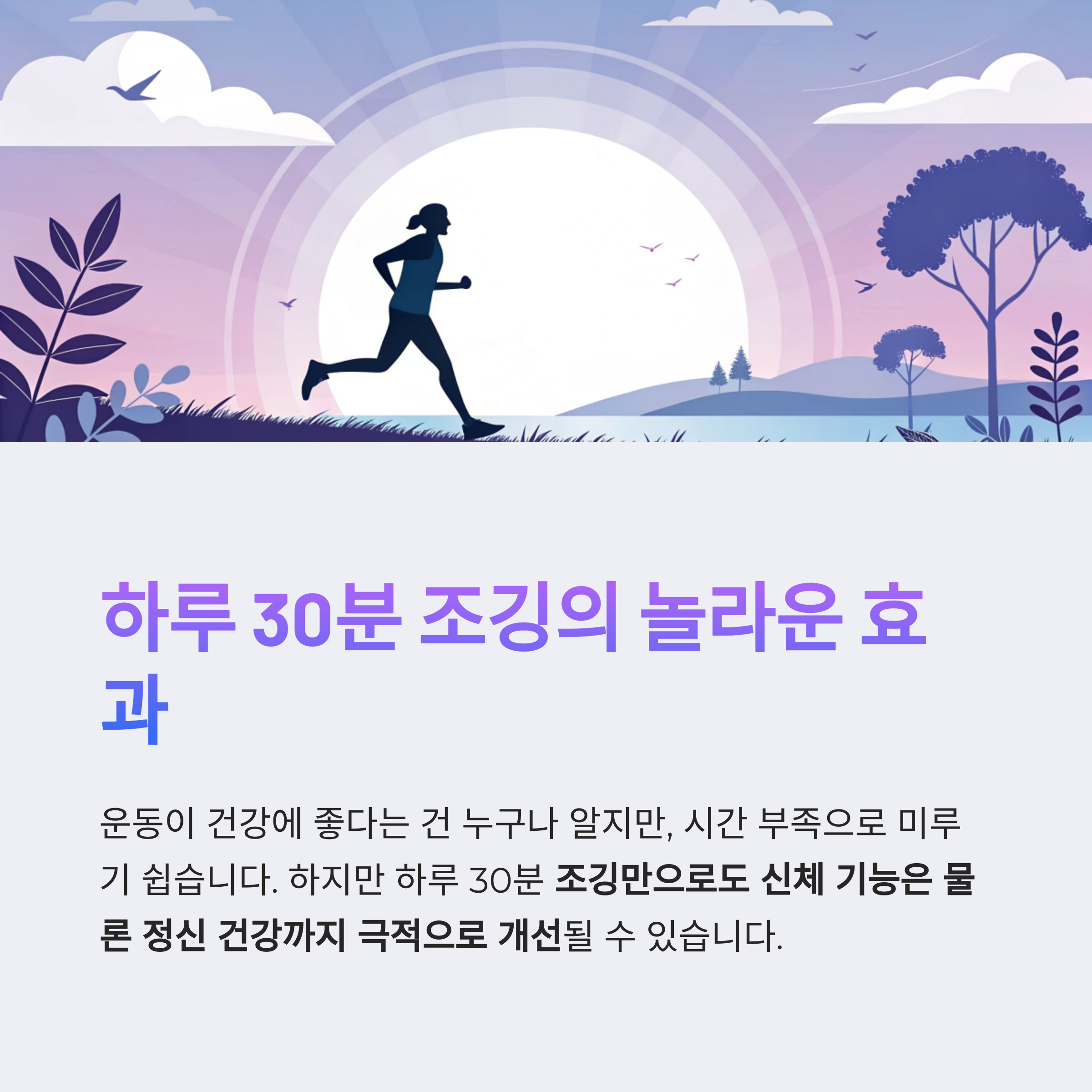 하지만 하루 30분, 조깅만으로도 신체 기능은 물론 정신 건강까지 극적으로 개선될 수 있습니다.
