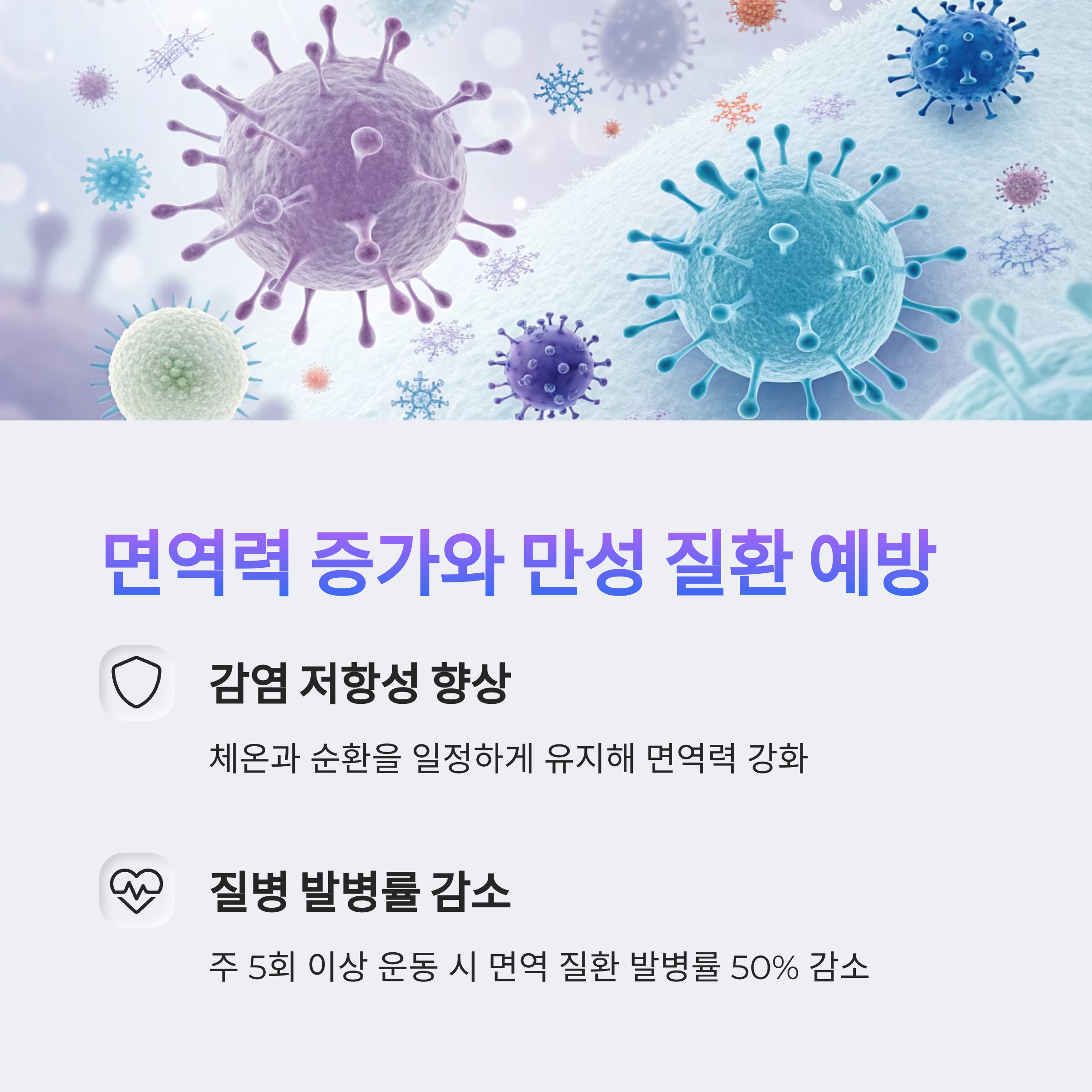 실제로 주 5회 이상 운동하는 사람은 면역 관련 질환 발병률이 50% 이하로 낮아집니다.