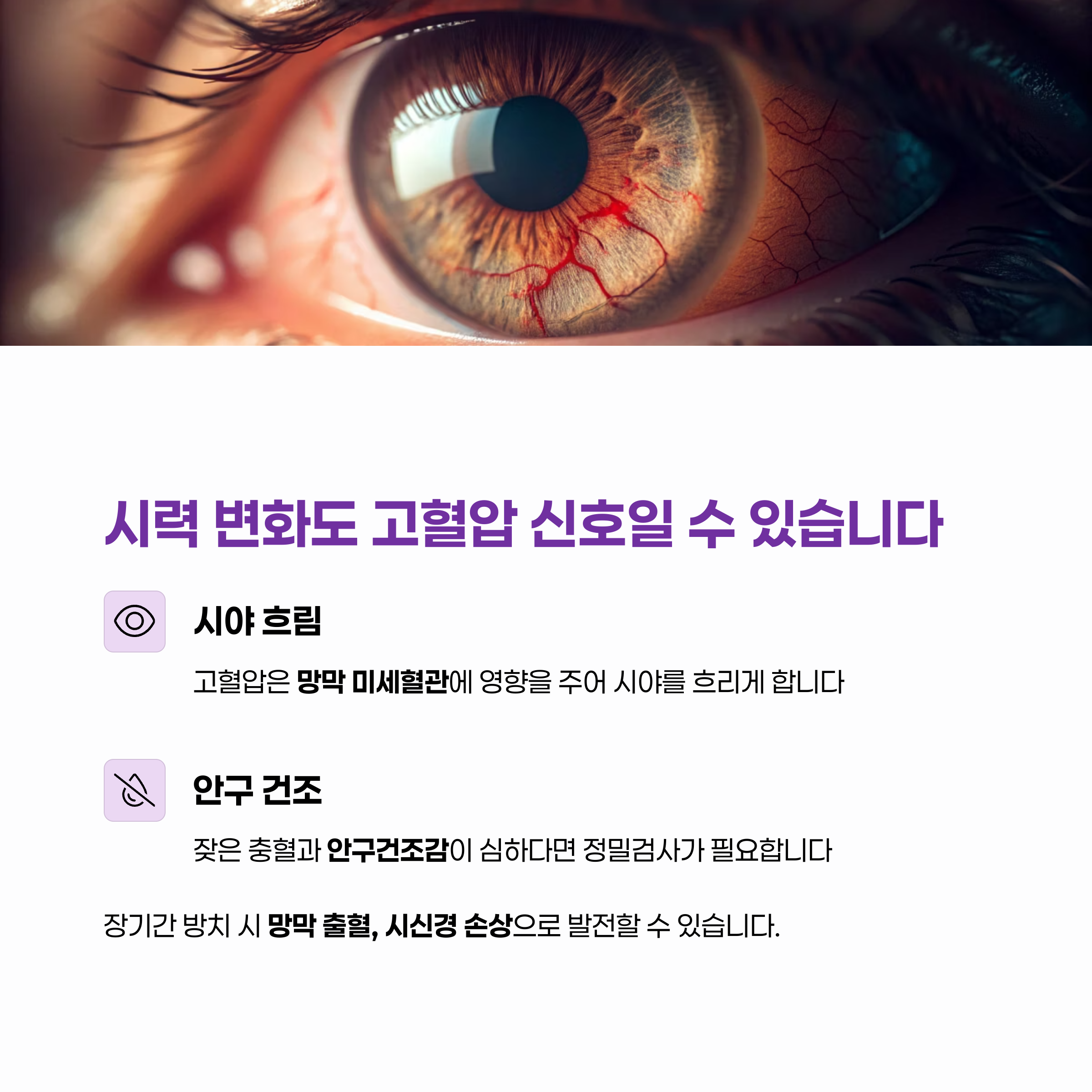 장기간 고혈압이 지속되면 망막 출혈, 시신경 손상으로 발전할 수도 있으며
