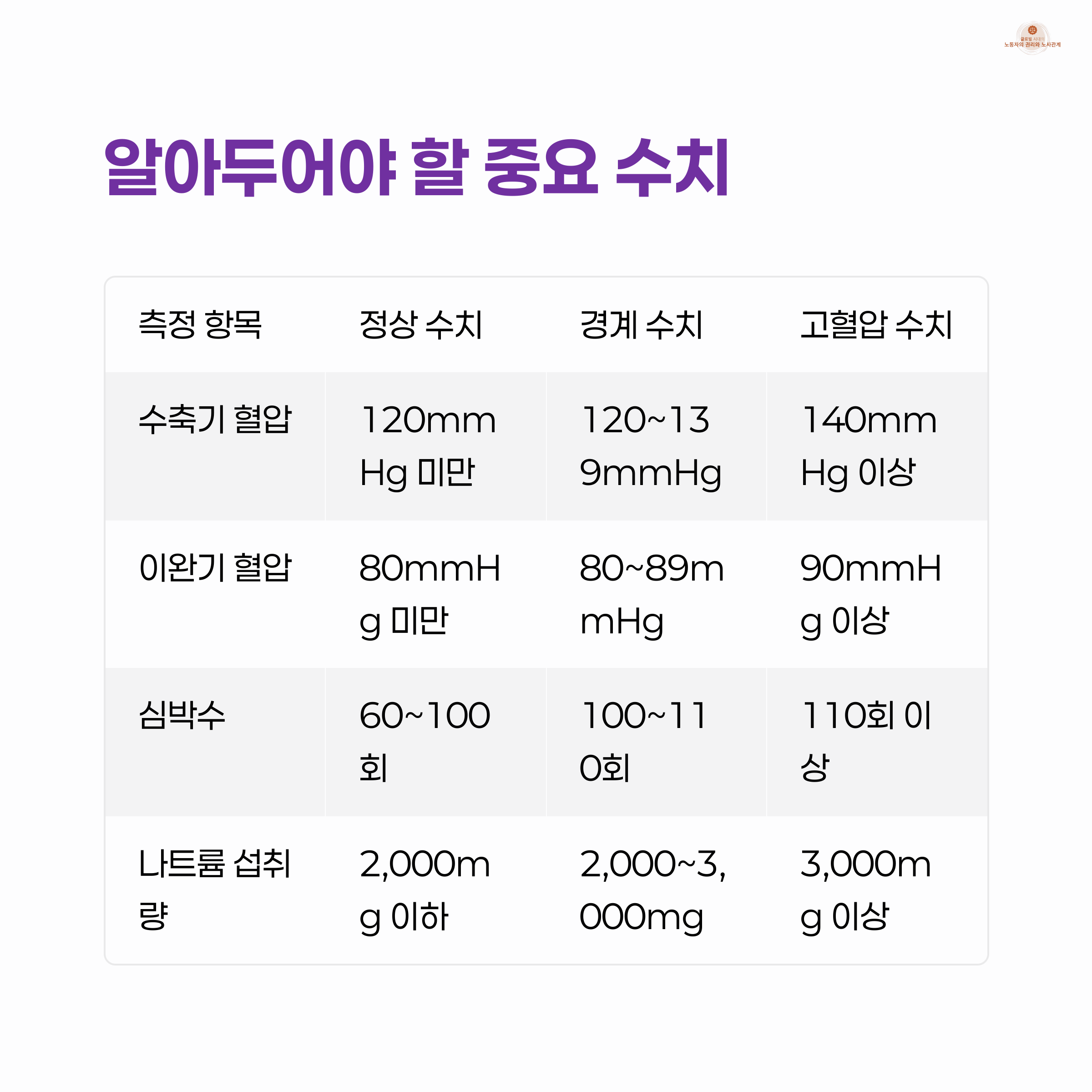 | 나트륨 섭취량 | 하루 2,000mg 이하 | 2,000~3,000mg | 3,000mg 이상 |
