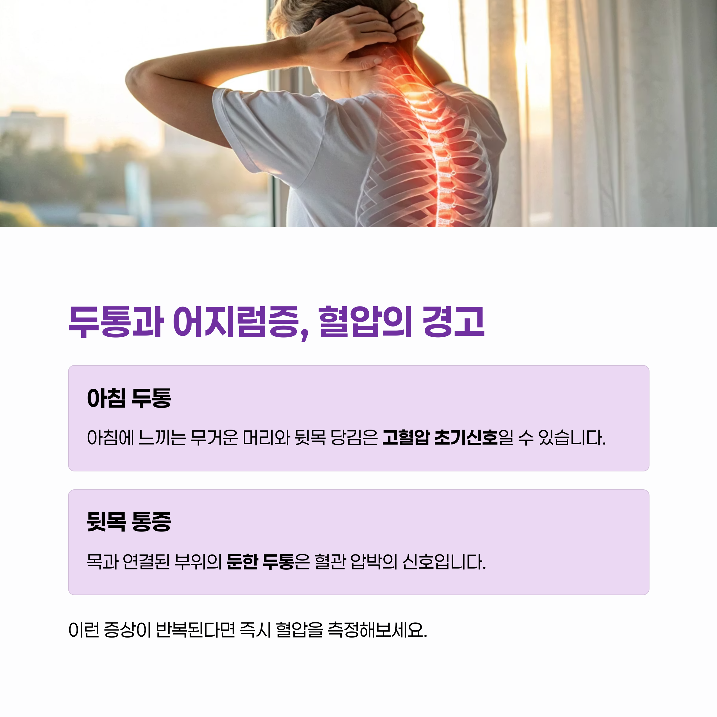 | 신체적 신호 | 뒷목 통증, 아침 두통 | 잦은 발생 여부 |