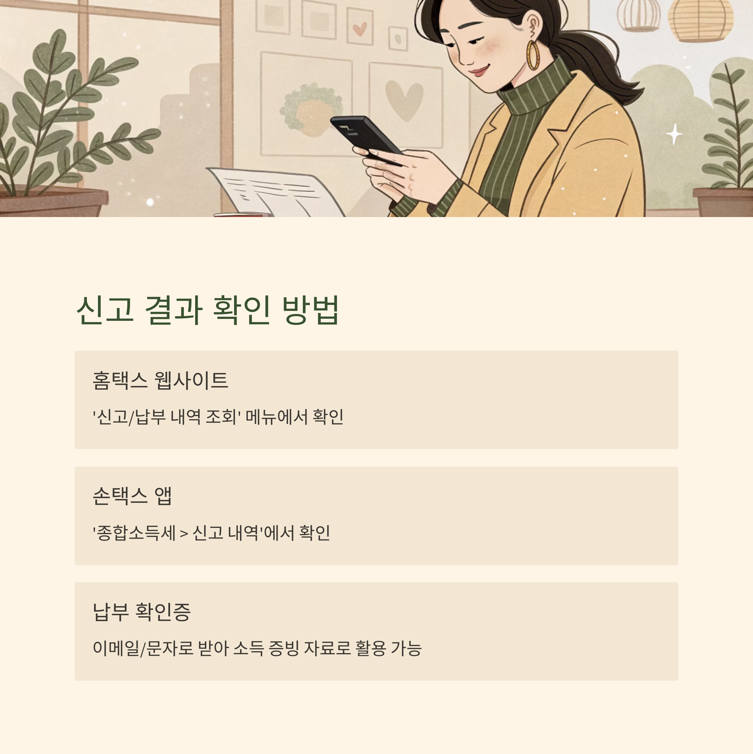 종합소득세 신고 결과는 홈택스 사이트 로그인 후 '신고/납부 내역 조회' 메뉴에서 확인할 수 있습니다. 이 메뉴에서 신고 여부, 납부 금액, 납부 완료 여부까지 한눈에 파악할 수 있습니다.