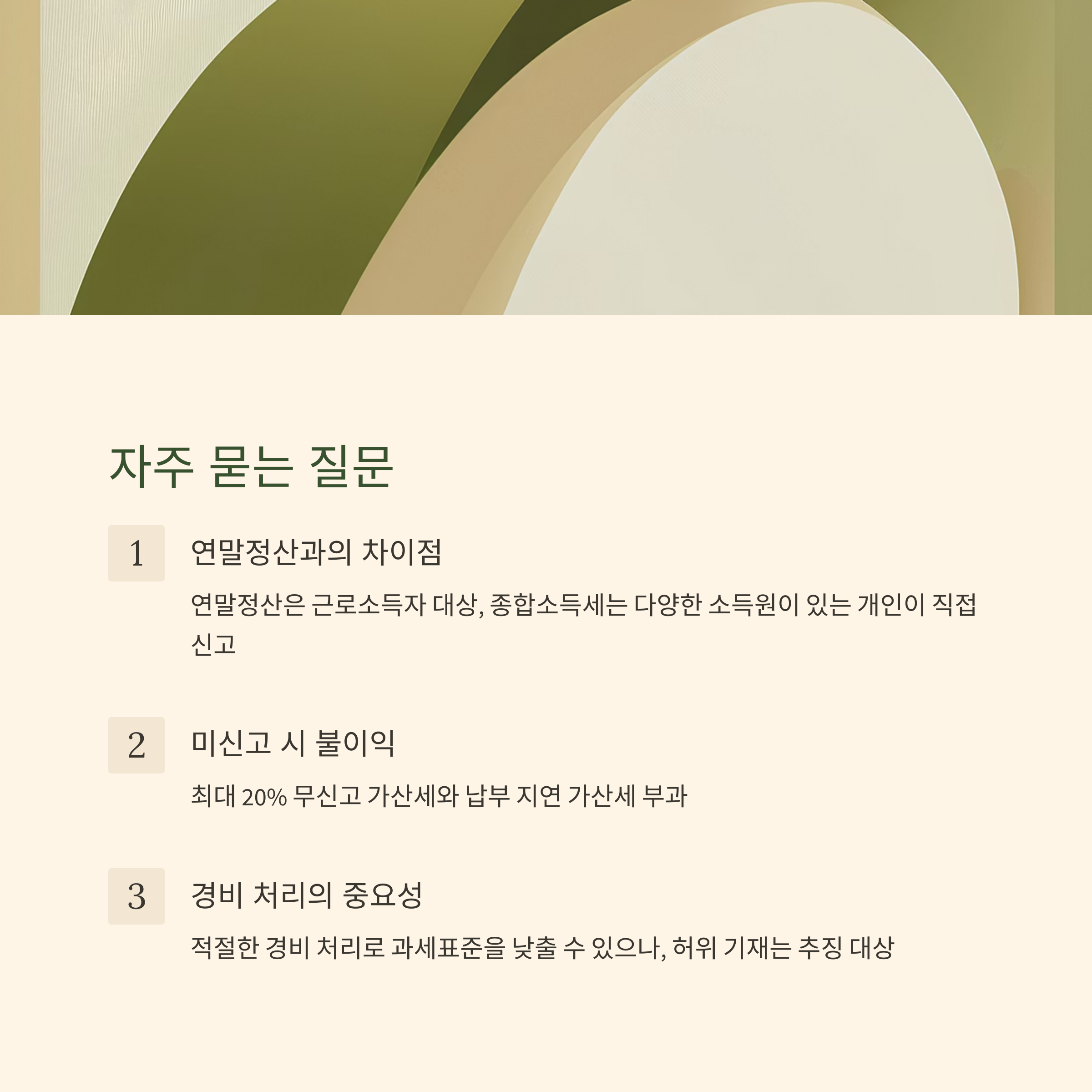 A3. 네, 경비 처리는 종합소득세 절세의 핵심 요소 중 하나입니다. 사업 관련 지출을 적절하게 경비로 인정받으면 과세표준을 낮출 수 있습니다. 단, 경비는 명확한 증빙이 필요하며, 허위 기재나 허위 증빙은 오히려 추징과 벌금으로 이어질 수 있으므로 주의가 필요합니다.