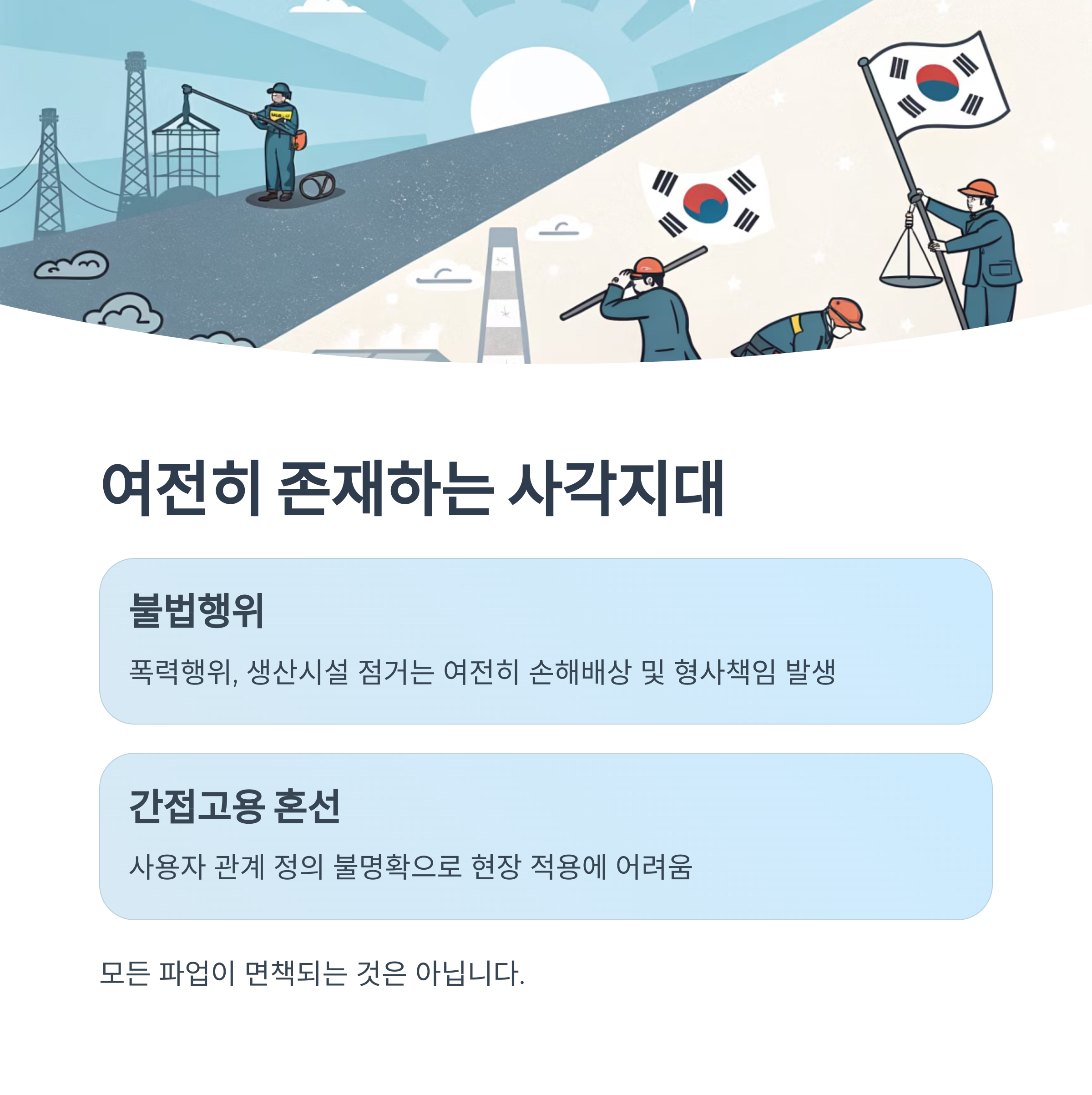 불법 폭력행위, 생산시설 점거 등은 여전히 손해배상 및 형사책임이 따를 수 있습니다.