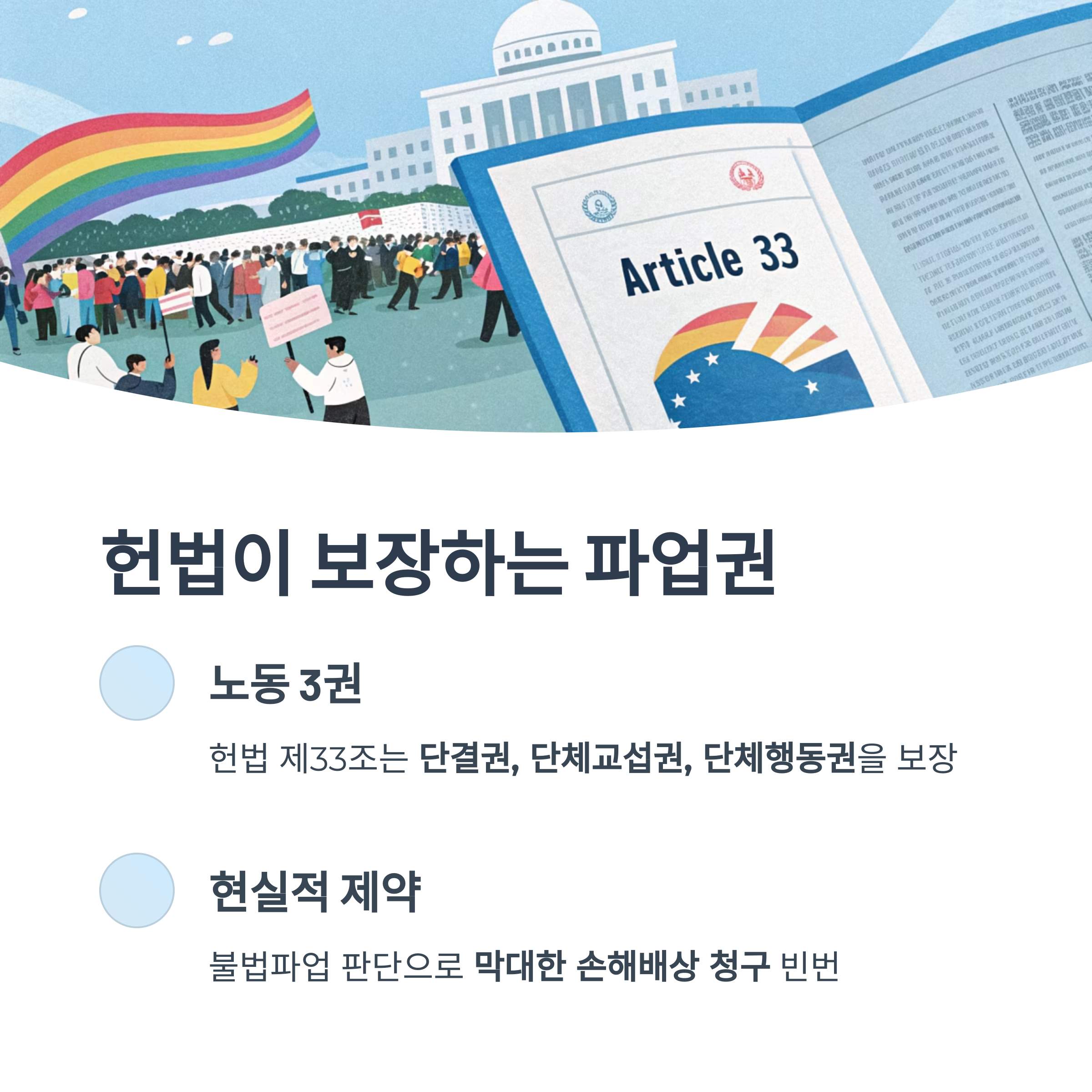 대한민국 헌법 제33조는 노동 3권(단결권, 단체교섭권, 단체행동권)을 보장합니다.