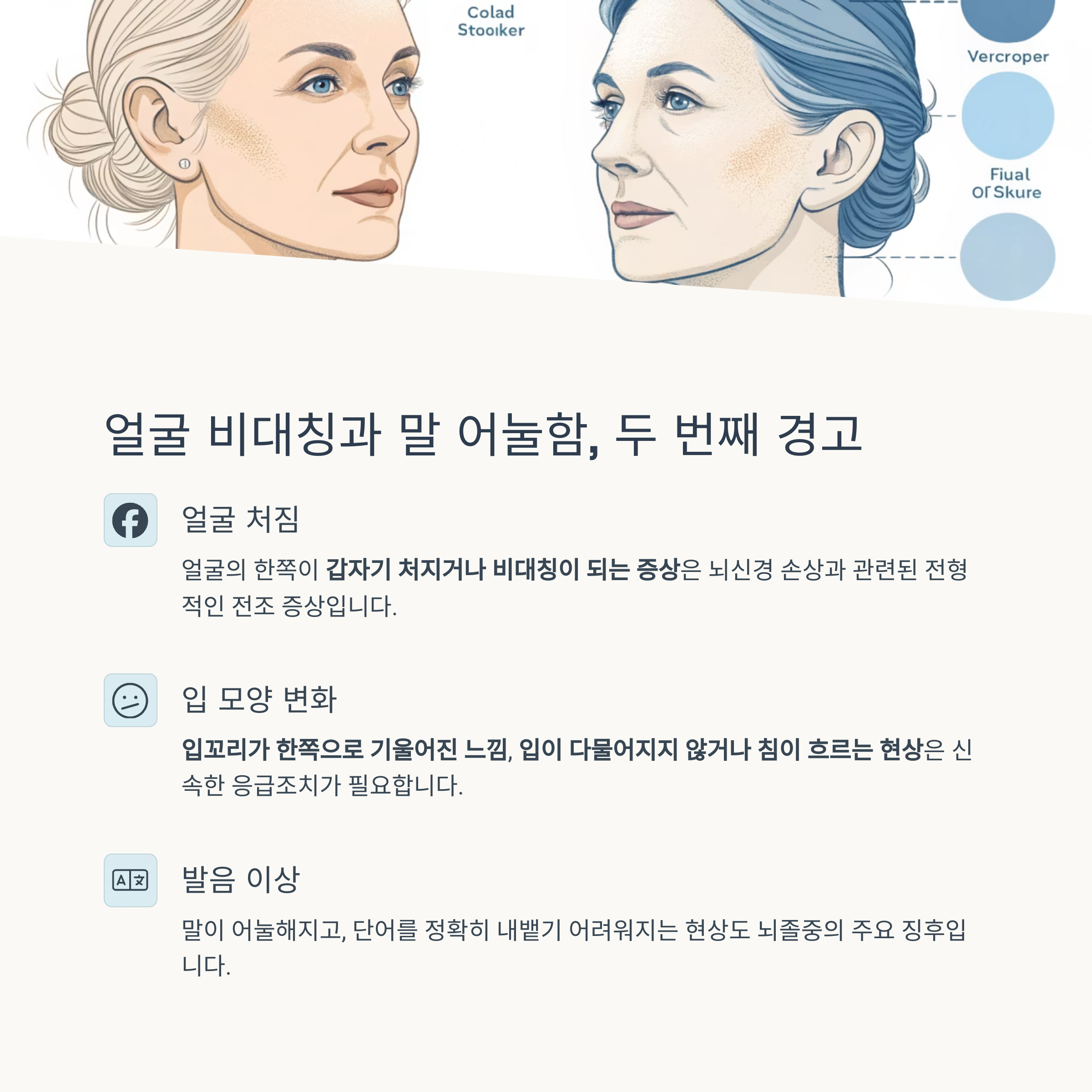 한쪽 얼굴 근육이 처지거나 말이 어눌해지는 것도 주요 경고 신호입니다