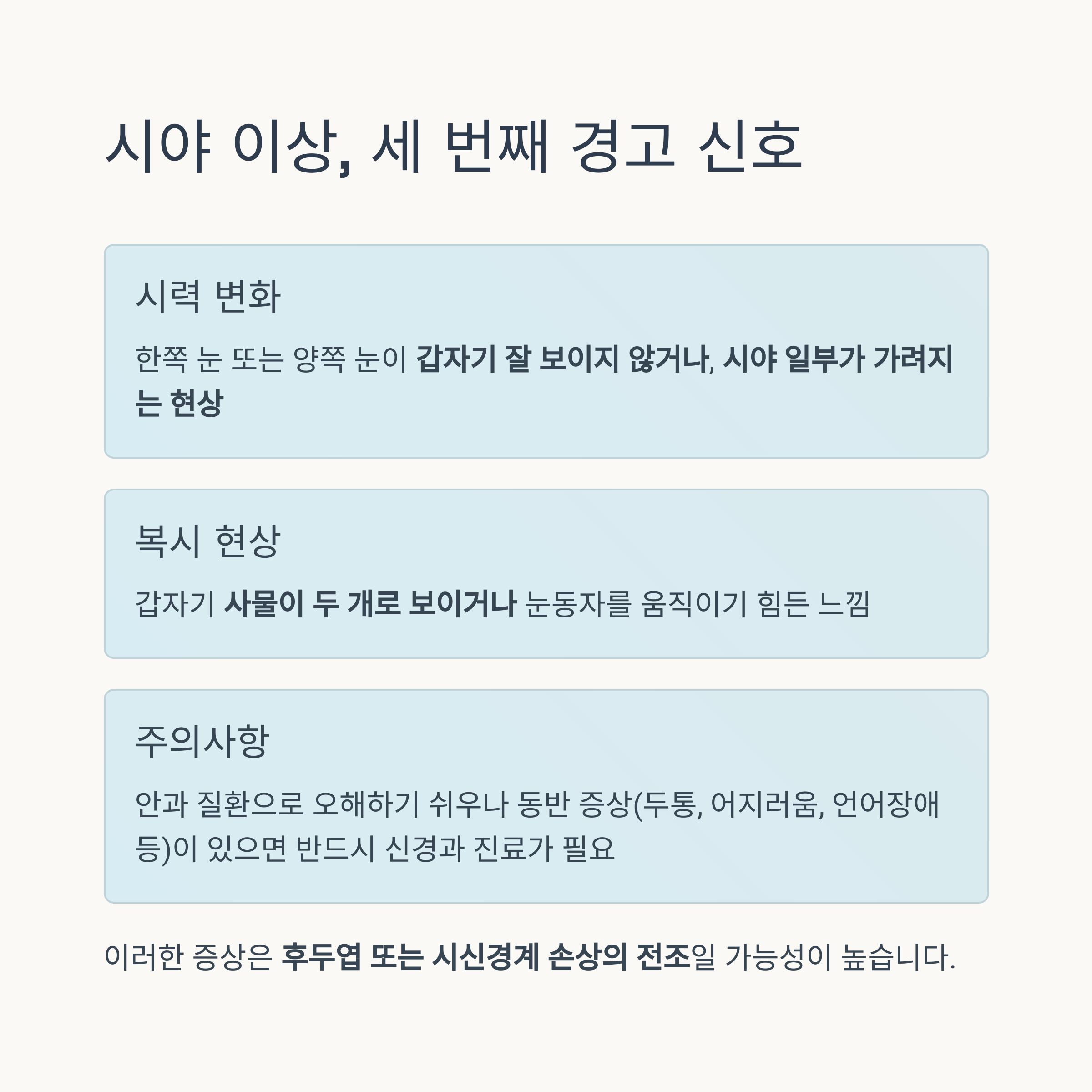 동반 증상(두통, 어지러움, 언어장애 등)이 있으면 반드시 신경과 진료가 필요합니다
