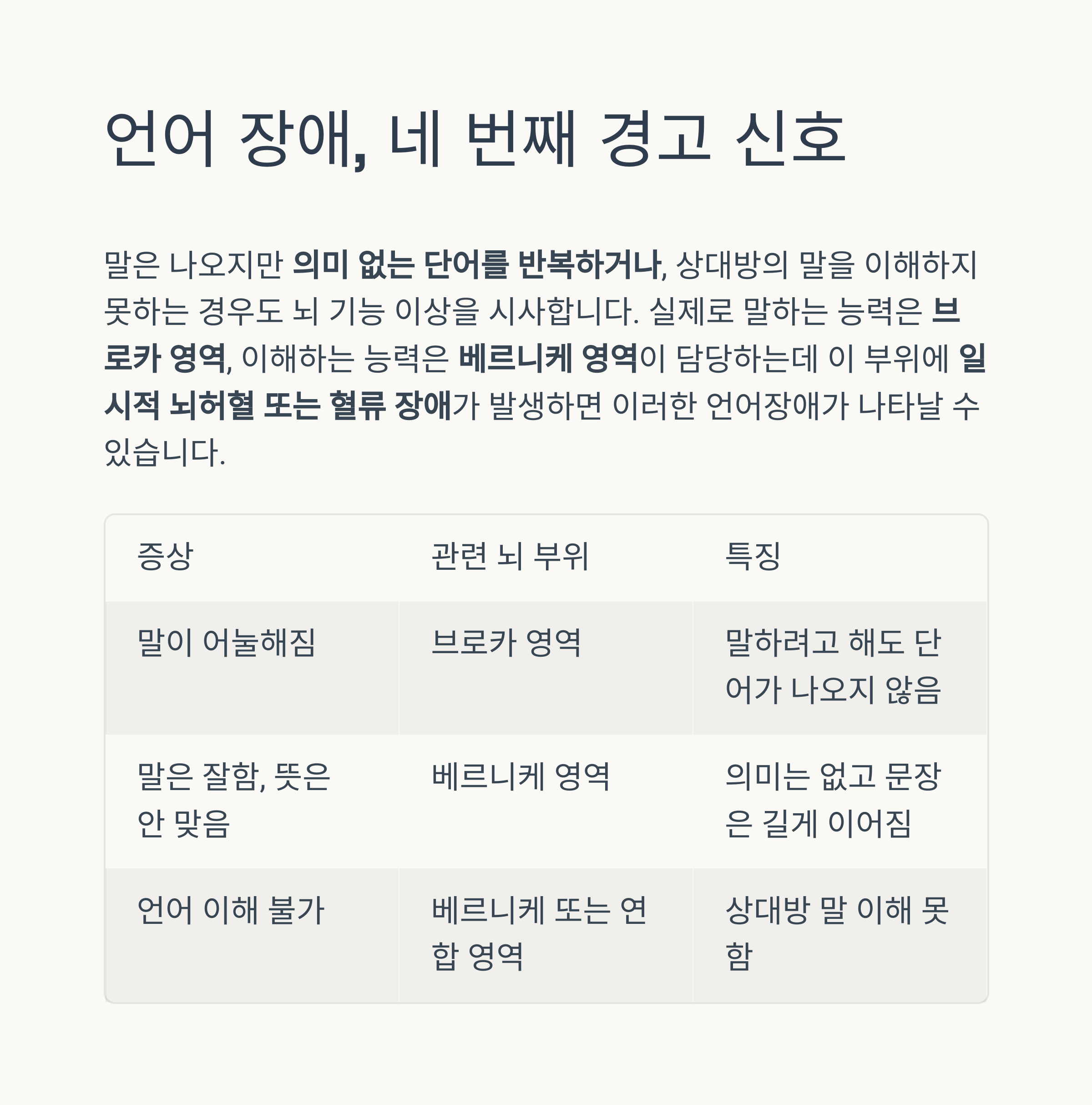 | 말이 어눌해짐 | 브로카 영역 | 말하려고 해도 단어가 나오지 않음 |