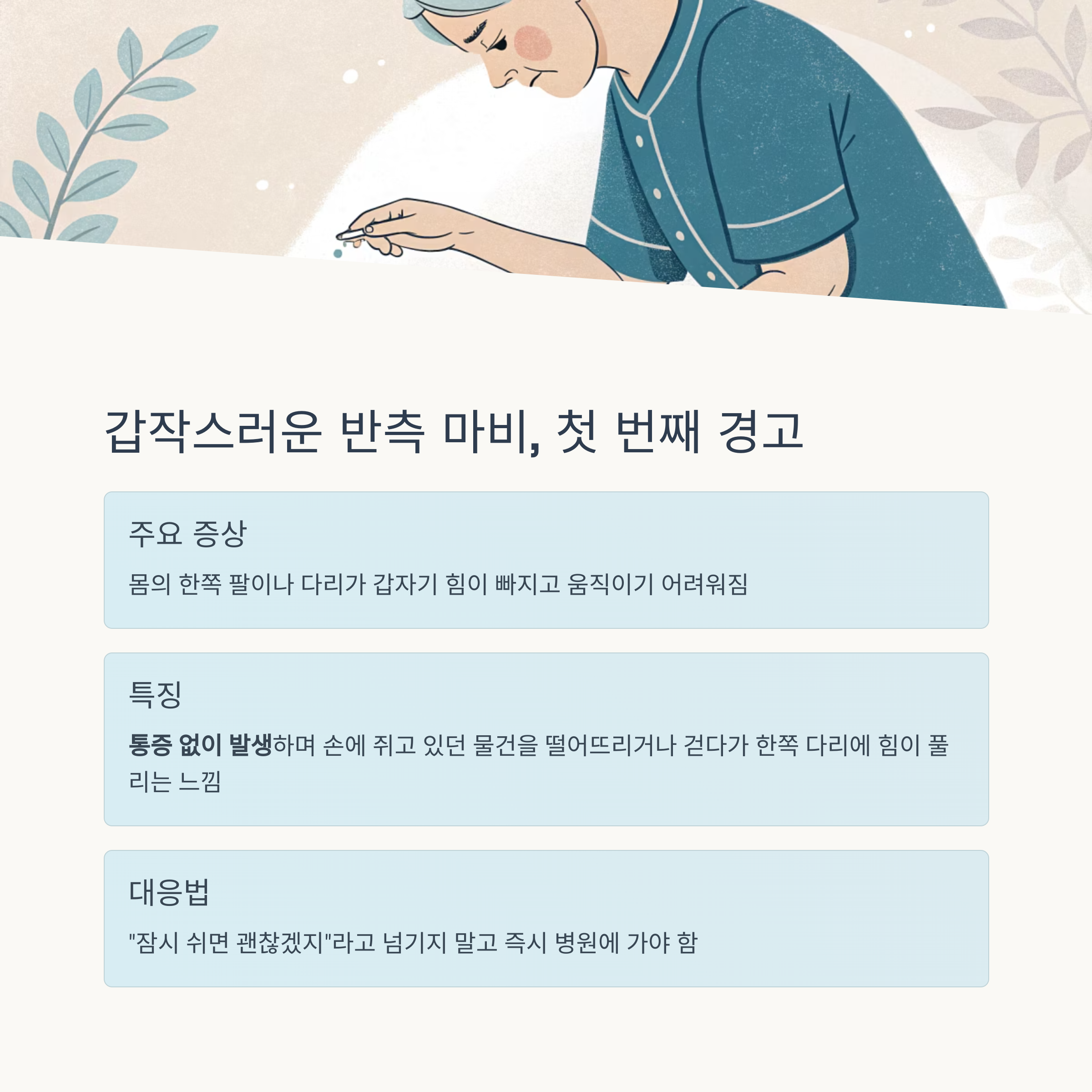 갑작스러운 반측 마비는 뇌졸중의 대표 전조 증상입니다