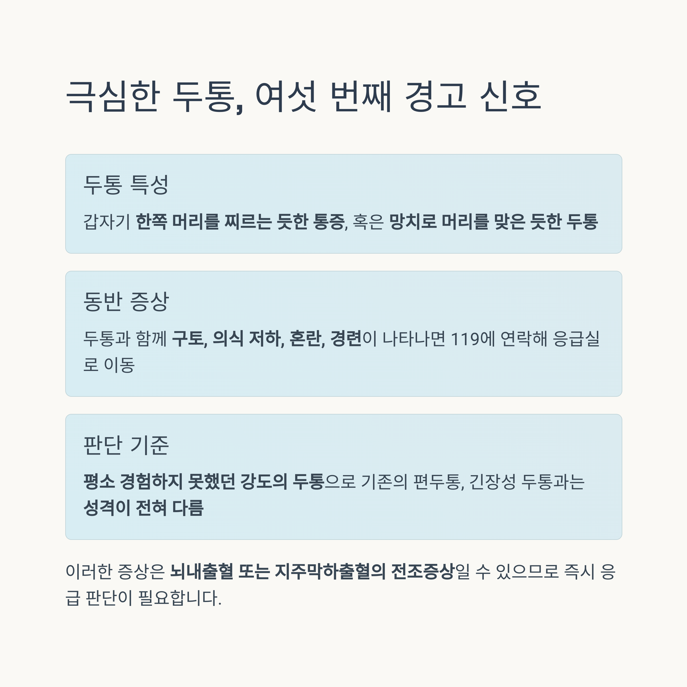 중요한 점은 평소 경험하지 못했던 강도의 두통이라는 점입니다