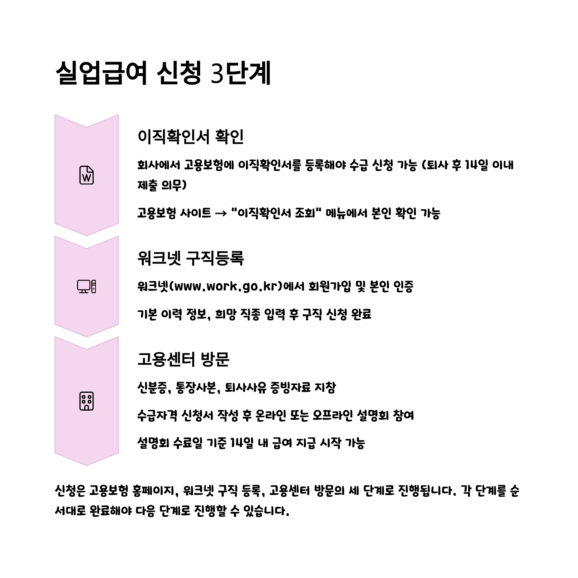 이직확인서 확인 → 워크넷 등록 → 고용센터 방문 → 수급자격 신청 → 실업인정 출석