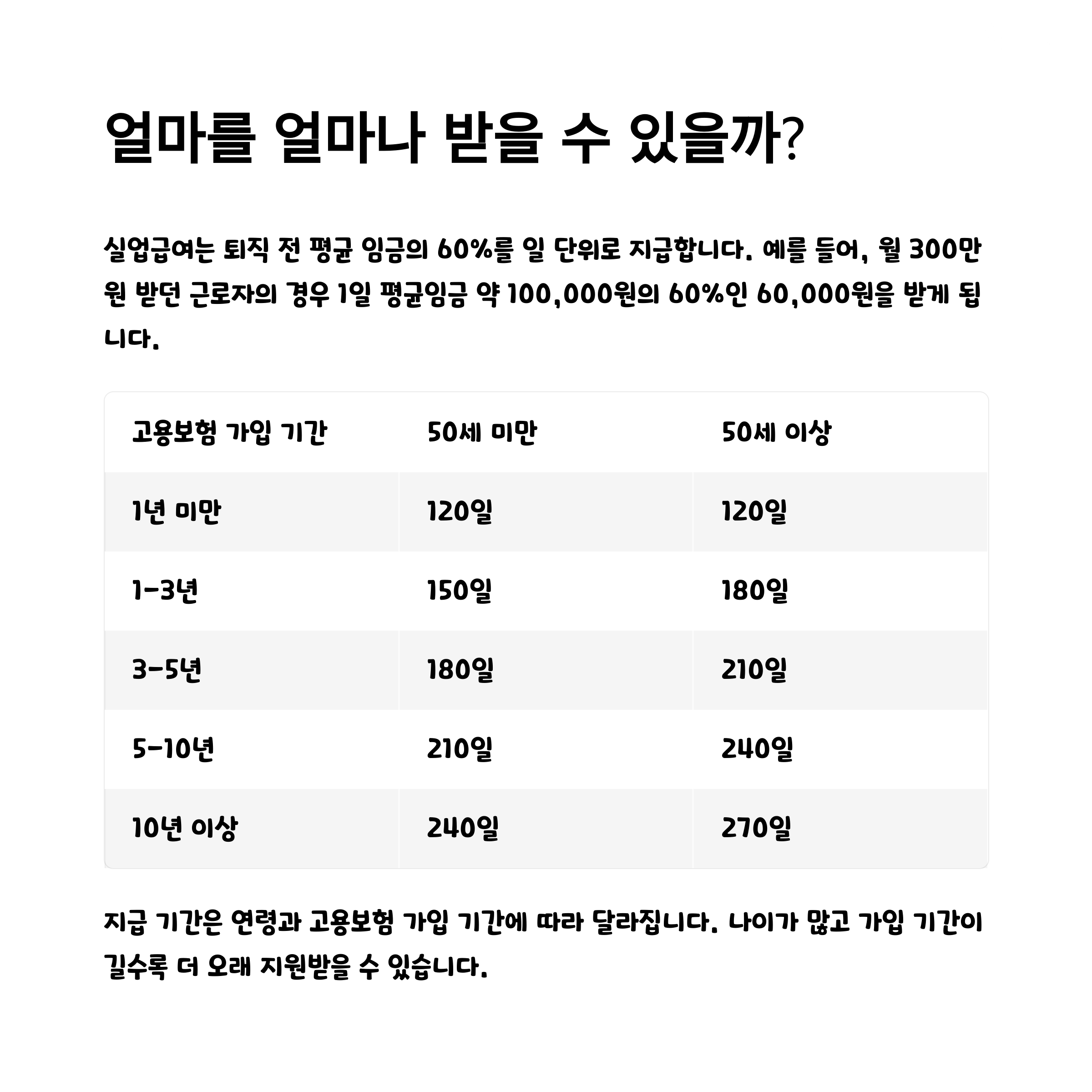 지급 기간은 다음과 같이 연령과 고용보험 가입 기간에 따라 달라집니다