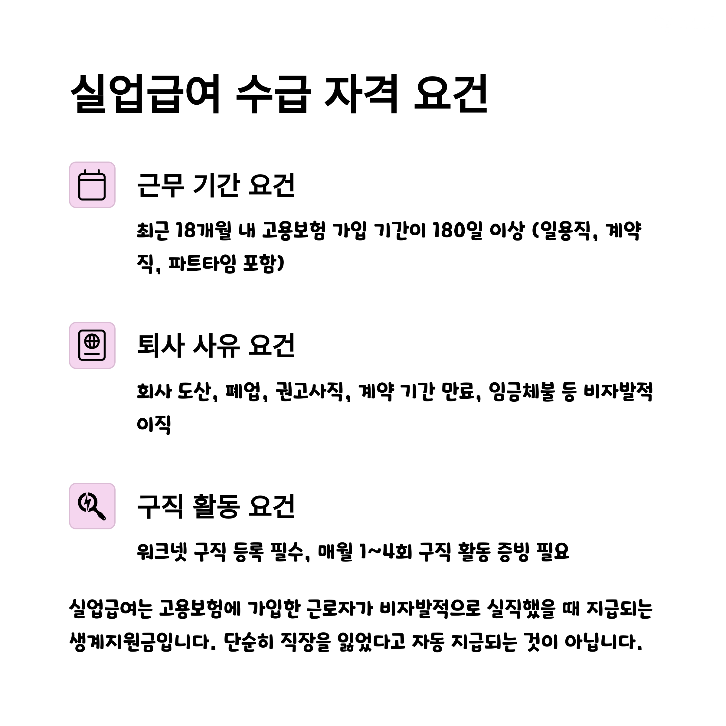 먼저 다음 조건을 모두 충족해야 실업급여 수급이 가능합니다