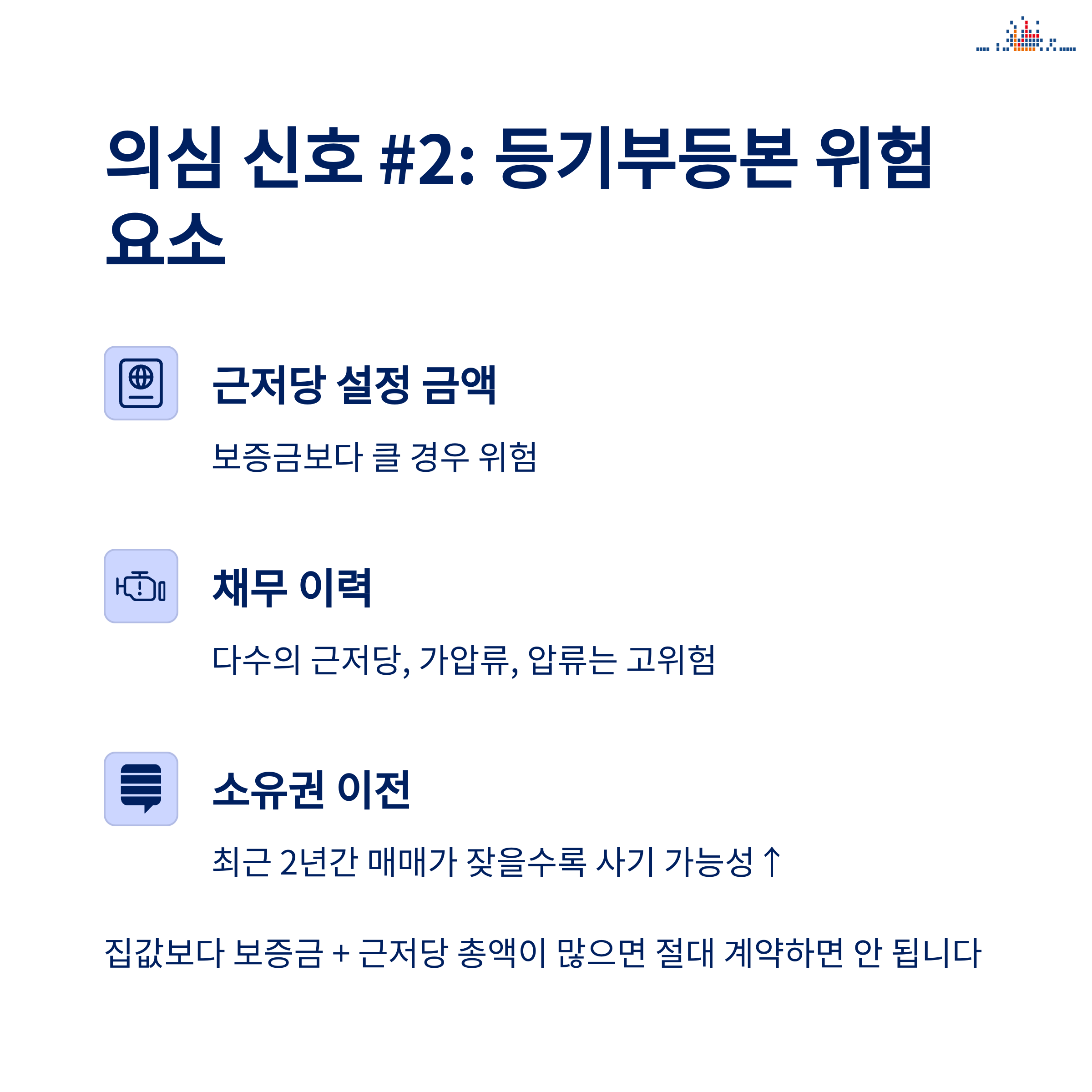 - 소유권 이전 횟수: 최근 2년간 매매가 잦을수록 사기 가능성↑