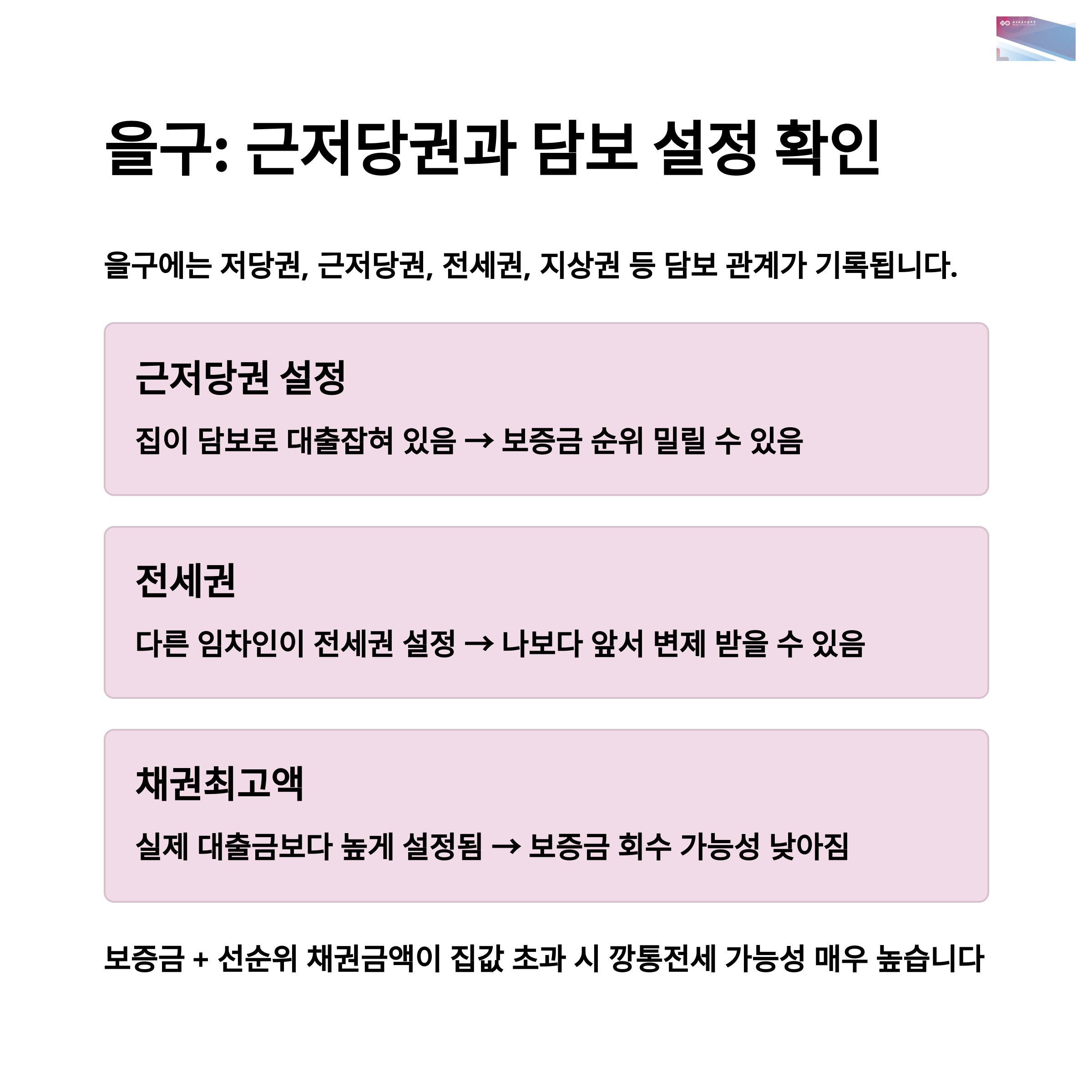 | 채권최고액 | 실제 대출금보다 높게 설정됨 → 보증금 회수 가능성 낮아짐 |