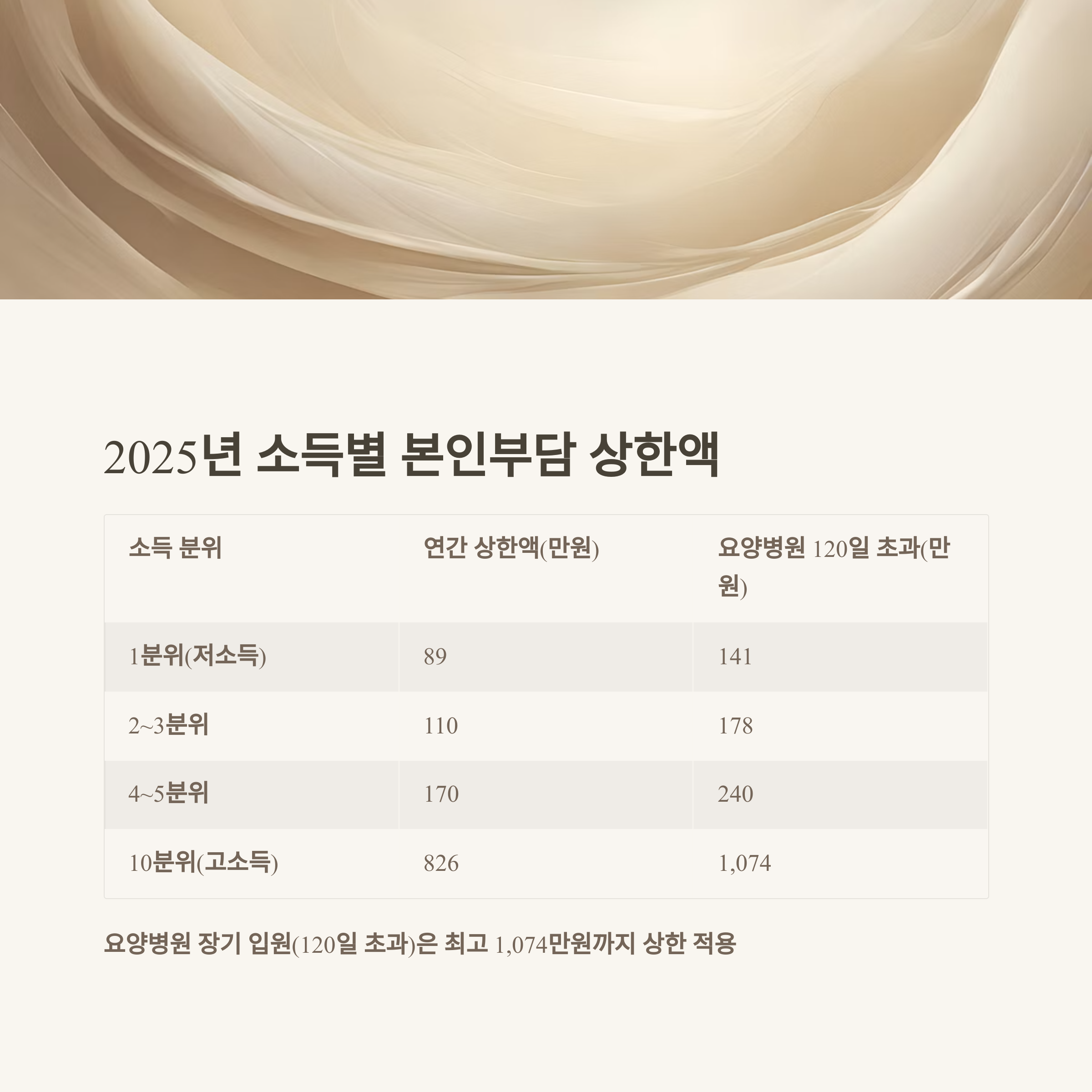 소득 분위 연간 상한액 (만원) 요양병원 120일 초과 시 (만원)