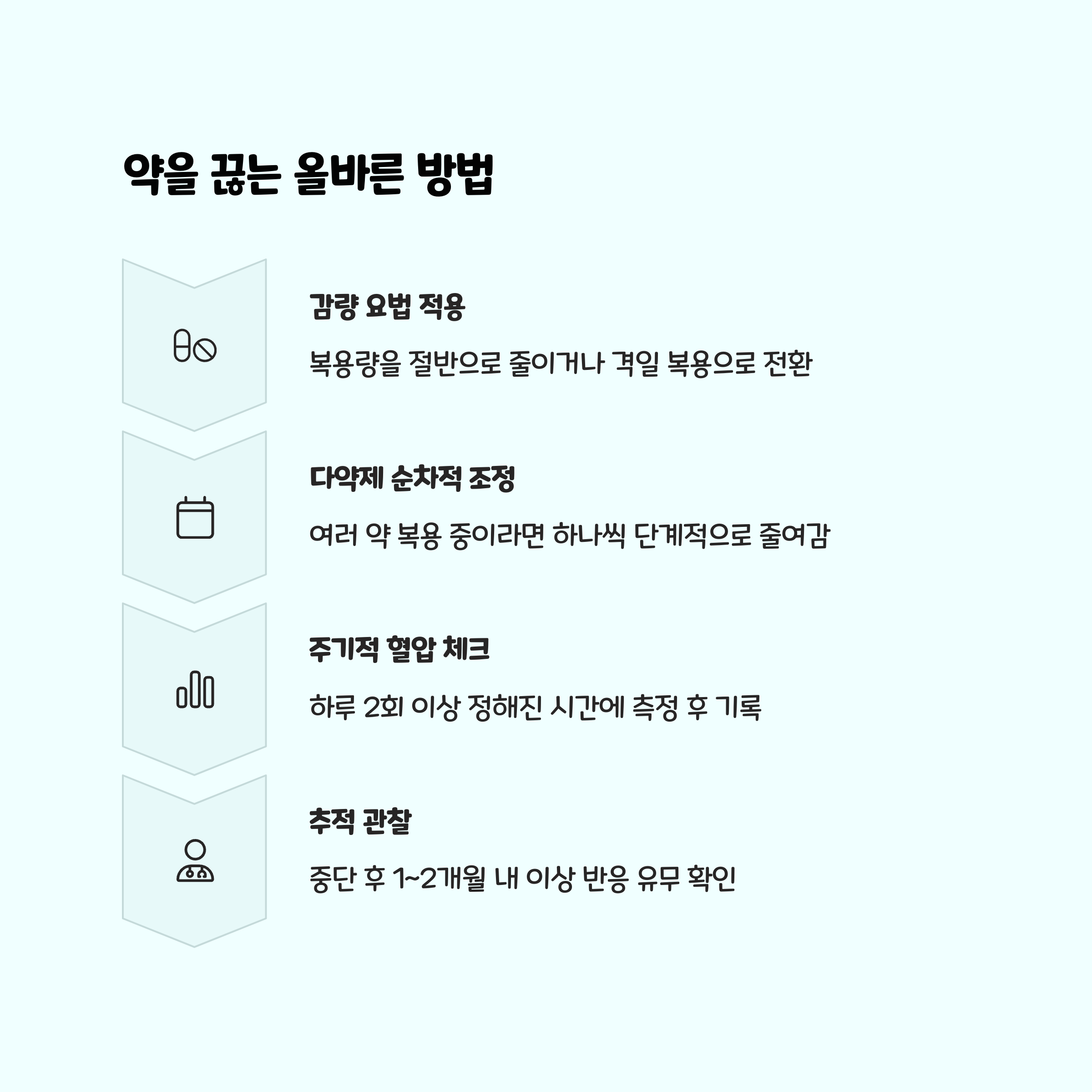 하루 2회 이상 정해진 시간에 혈압 측정 후 기록 - 중단 후 1~2개월 내 이상 반응 유무 체크