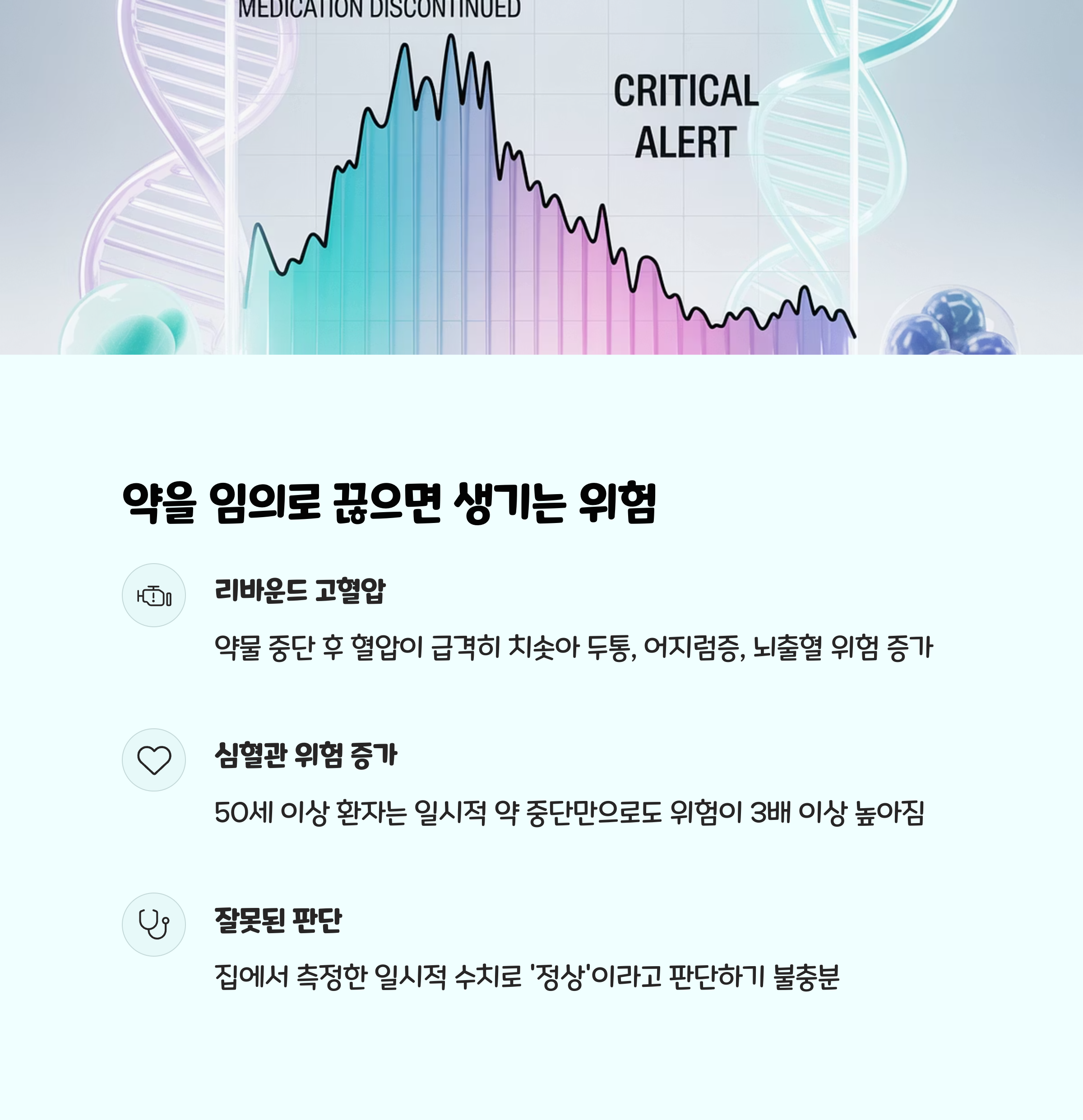 약물 중단 후 급격히 혈압이 치솟으며 두통, 어지럼증, 심하면 뇌출혈 위험까지 증가 - 심부전, 뇌졸중의 위험 증가