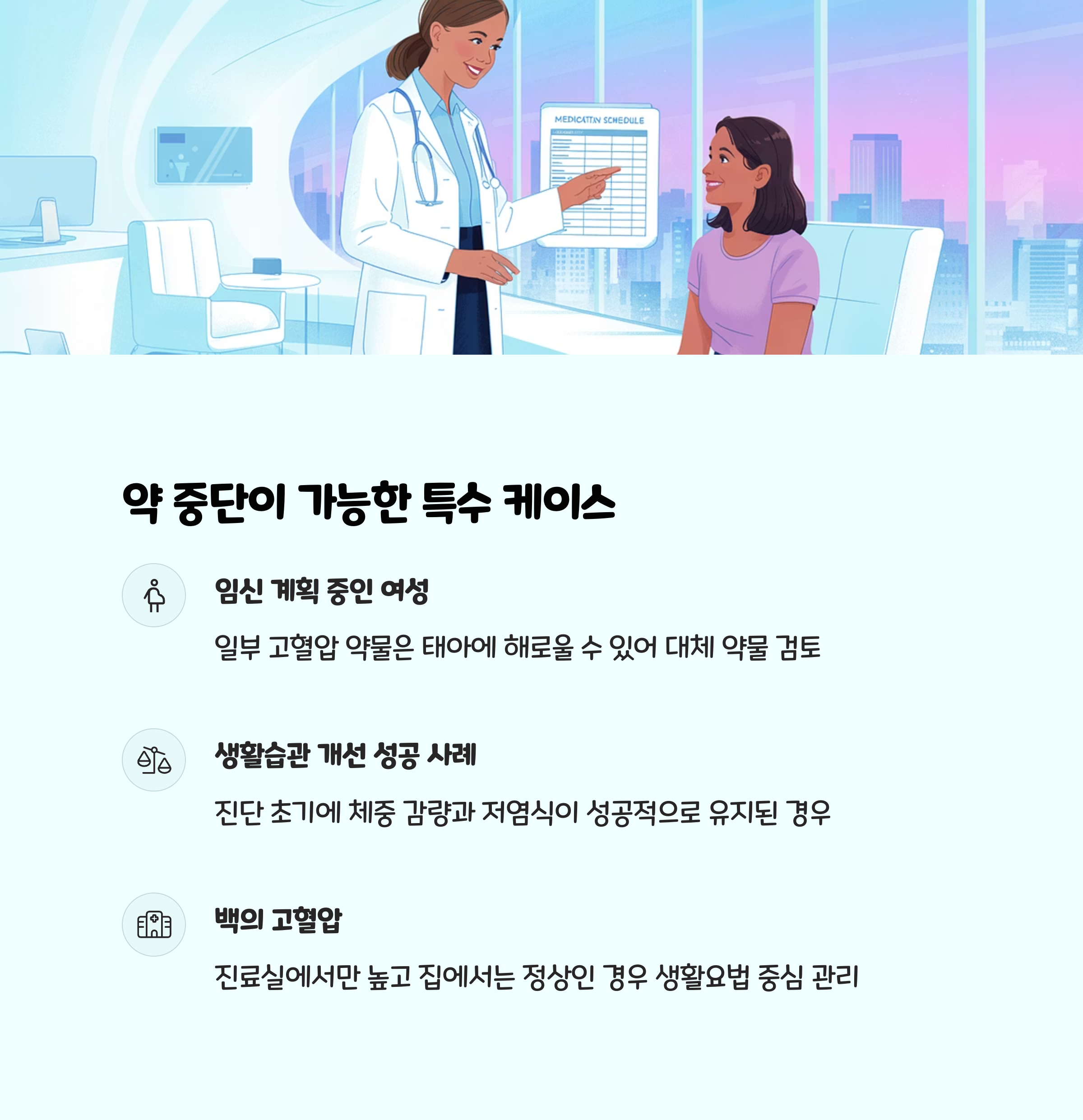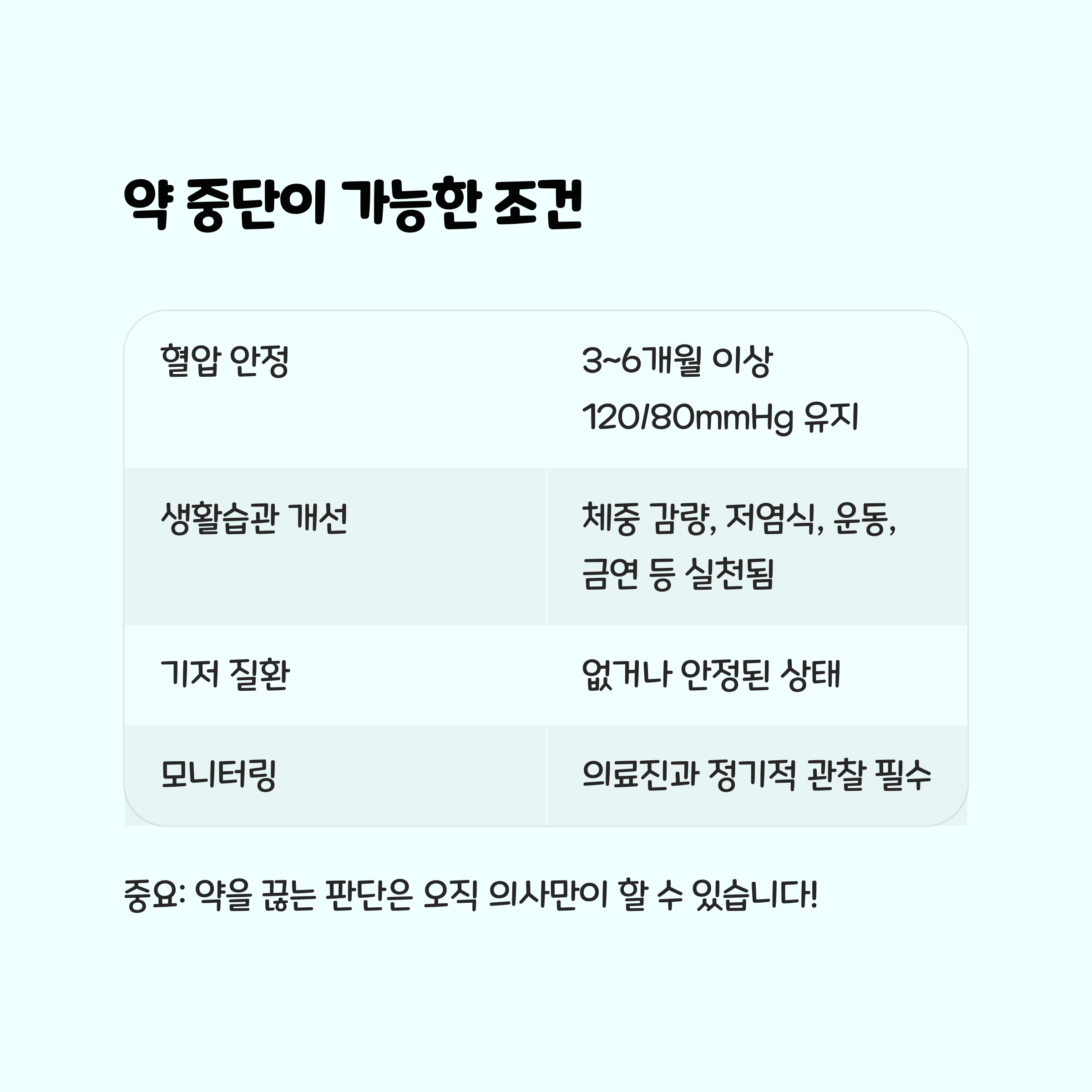 | 혈압이 꾸준히 정상 범위 유지 | 3~6개월 이상 120/80mmHg 유지 |