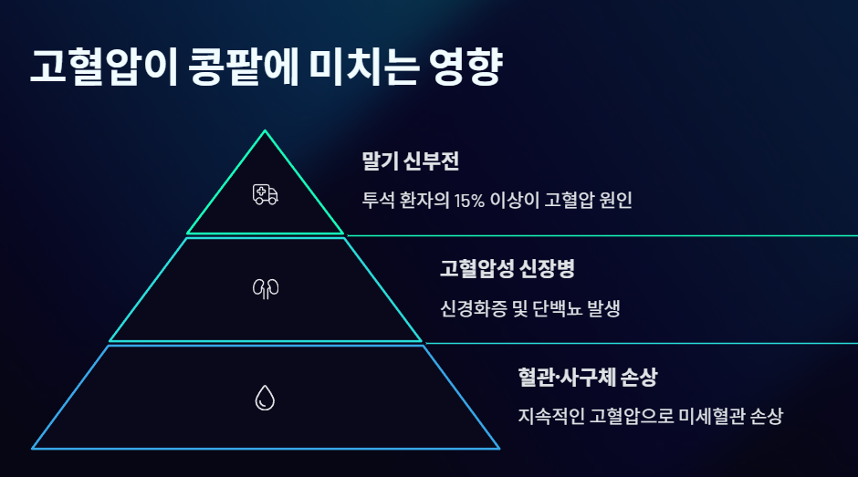 고혈압은 콩팥의 미세혈관과 사구체를 손상시켜 만성 콩팥병, 심지어 말기 신부전으로 이어질 수 있는 위험한 질환입니다. 콩팥 손상과 고혈압은 서로 악순환을 이루므로, 철저한 혈압 관리와 건강한 생활 습관 개선이 무엇보다 중요합니다.
