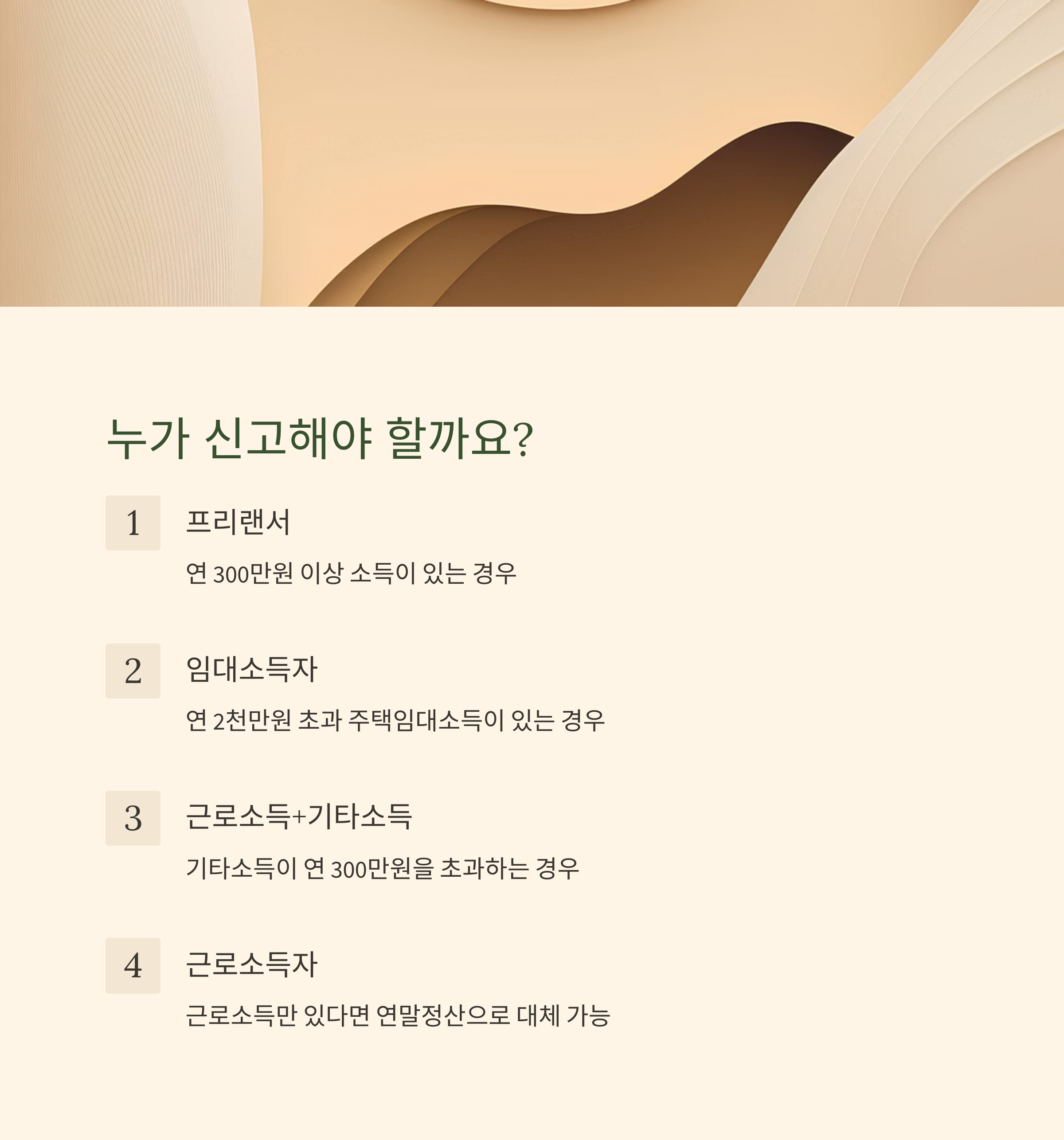 종합소득세 신고 대상자는 크게 1년 동안 근로소득 외에 다른 소득이 있는 모든 개인입니다. 여기에는 프리랜서, 사업소득자, 임대소득자, 이자·배당소득이 많은 투자자 등이 포함됩니다. 월급 외 소득이 연 300만 원을 넘는 경우 의무적으로 종합소득세를 신고해야 하며, 그렇지 않으면 가산세가 부과됩니다.